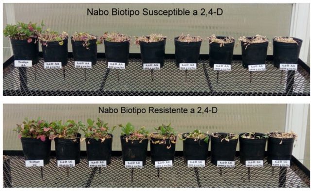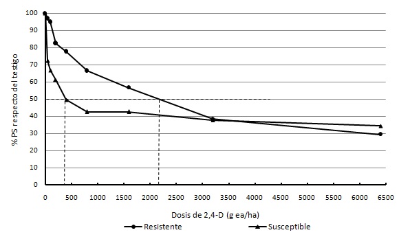 En condiciones de invernadero se realizaron bioensayos de dosis respuesta. Para esto se recolectaron semillas de la maleza de lotes donde se registraron fallas de control y se sembraron en macetas. Las plantas crecieron hasta el estado de roseta 6 hojas y posteriormente fueron aplicadas con 2,4-D sal dimetil amina CS 60 % a dosis de 0, 50, 100, 200, 400, 800, 1600, 3200 y 6400 g ea/ha. Como testigo fue utilizado un biotipo sensible obtenido en la misma localidad.