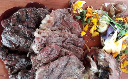 Para acompañar el asado con cuero y la carne de Wagyu, Emanuel mezcló papas hervidas en caldo y doradas en la parrilla, ensalsadas con una mayonesa casera de huevo, aceite de coco y mango. También le incorporó cáscaras de limón, cebolla morada caramelizada y flores silvestres directamente recogidos de la naturaleza.