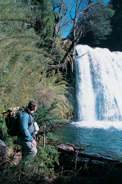 El sendero está señalizado y la caminata es suave. Andamos por un mallín poblado de ñires y después seguimos por un laberinto de cañas colihues que forman una pared fresca y contundente. El verde es el refugio de zorzales, chucaos y rayaditos. Con suerte se puede ver un pájaro carpintero. Salimos de nuevo al río que tiene un cauce ancho de pura piedra, y volvemos al bosque, para finalmente encontrar la cascada. En realidad son tres saltos de agua y nos sorprenden más de lo esperado. Hacen honor al nombre indígena que significa susurro del agua. Sólo podemos llegar hasta el primero y mirar de lejos los otros dos, que están accesibles a partir de diciembre cuando el río baja y se puede caminar por el lecho.