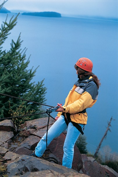 Subimos hasta el lugar indicado y nos preparamos: casco, arnés y soga y a descender. Colgadas sobre la bahía, caminamos en vertical sobre la roca con la extraña sensación de vacío. Seguimos las precisas indicaciones de Fabián y todo va de maravillas; llegamos a salvo hasta el final, con la frente bien alta.