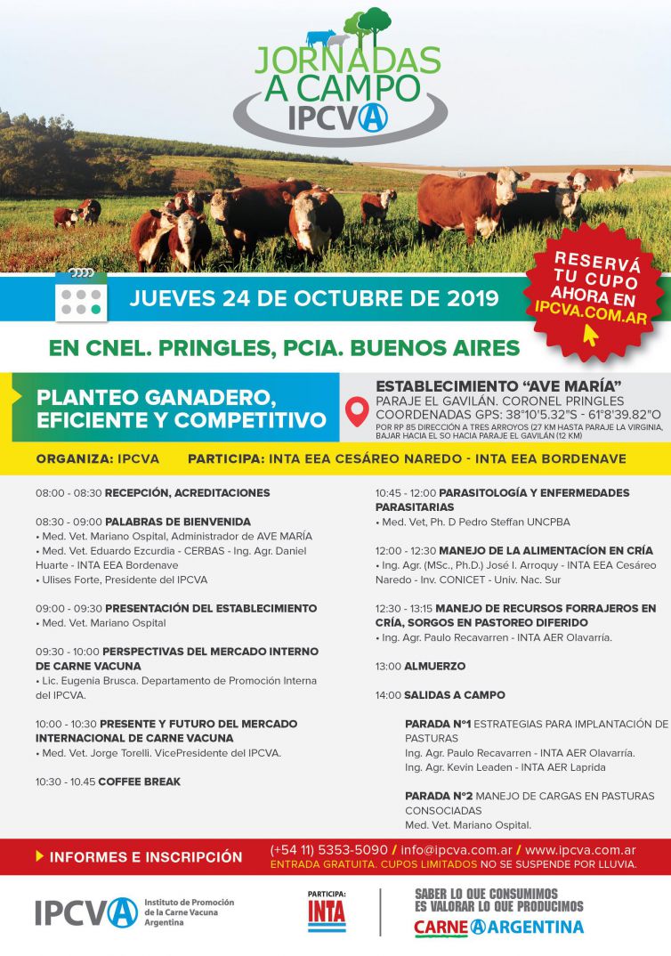 El próximo jueves 24 de octubre de 2019, el Instituto de Promoción de la Carne vacuna Argentina (IPCVA) realizará una nueva jornada a campo en el establecimiento "Ave María" de Coronel Pringles, Provincia de Buenos Aires.