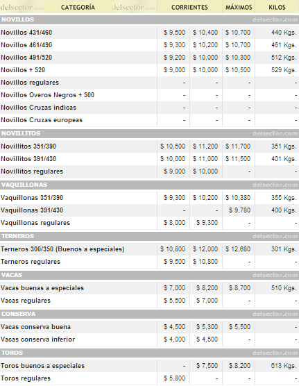 Aparecieron algunos lotes especiales de terneros que -sin generar cambios en la tendencia de la categoría- marcaron máximos destacados de hasta $12,68. La vaca, que venia de varias ruedas consecutivas en alza, sufrió una baja que rondó el 3%; pero cabe destacar que salió con muchas agilidad y que el interés sigue estando y muy firme por este tipo de haciendas.