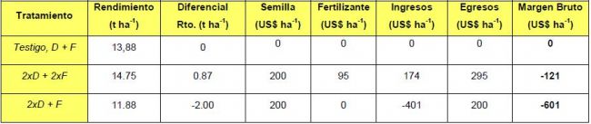 El segundo factor a considerar es el económico. Los técnicos mencionados hicieron las cuentas correspondientes. Consideraron como valor cero (0) el margen bruto del T1 (Testigo en la tabla N° 1); y para los demás tratamientos se resume la variación observada respecto del T1. De este modo pueden verse en la Tabla N° 1 los resultados. La situación de doble densidad de semillas y doble dosis de fertilizante (2xD+2xF) muestra, en valores absolutos, un rendimiento levemente superior, pero con una margen bruto inferior en 121 dólares/ha de campo doblemente sembrada y fertilizada. La diferencia es aún mayor para el T2 (2xD+F) ya que el rendimiento es claramente menor.
