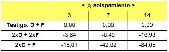 La tabla N° 2 muestra entonces cuánto varía el margen bruto promedio de un lote de maíz, tal el sembrado para este estudio. Cuando el área superpuesta es, por ejemplo, de 7 % el resultado económico mencionado promedio del lote será 8.49 dólares/ha inferior, cuando el trabajo de siembra incluye la fertilización; y la diferencia crece hasta 42.02 dólares/ha cuando la fertilización se realiza previa a la siembra.
