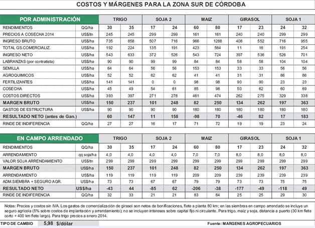 El cuadro adjunto muestra la proyección de resultados para la zona sur de Córdoba sobre la base de los precios estimados a cosecha 2014 para trigo, girasol, maíz y soja. Se presentan las cifras para los cultivos realizados por administración en campo propio y bajo la forma de arrendamiento en campos de terceros.