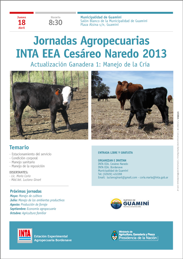 Jornadas a campoActualización ganadera: Manejo de la CríaEl INTA continúa con las jornadas de capacitación, esta vez en la ciudad de GuaminíFacebook0X0LinkedIn0e-Mail0WhatsApp0Más18 Abr 2013 http://inta.gob.ar/eventos/jornadas-agropecuarias.-actualizacion-ganadera-1-manejo-de-la-cria