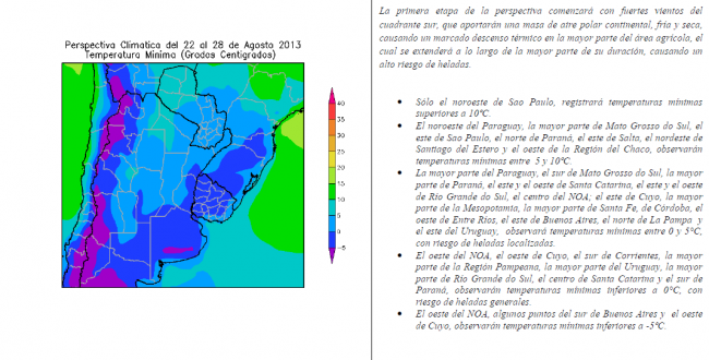 La perspectiva comenzará con fuertes vientos del cuadrante sur, que aportarán una masa de aire polar continental, fría y seca, causando un marcado descenso térmico en la mayor parte del área agrícola, el cual se extenderá a lo largo de la mayor parte de su duración, causando un alto riesgo de heladas.