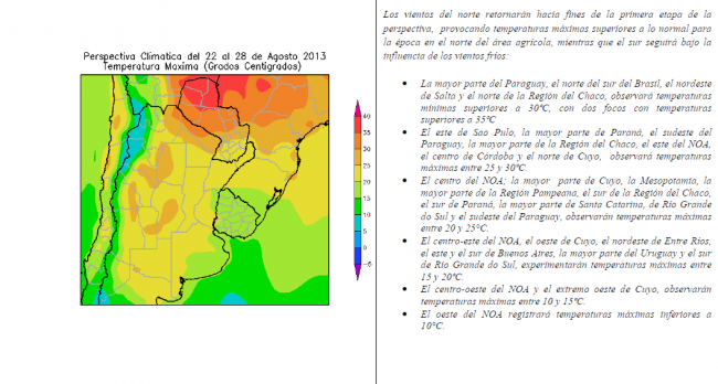 Las precipitaciones serán escasas en la mayor parte del área agrícola, a excepción de su porción nordeste, donde se registrarán valores moderados a abundantes, con focos de tormentas severas. Los vientos del norte retornarán hacia fines de la primera etapa de la perspectiva, provocando temperaturas máximas superiores a lo normal para la época en el norte del área agrícola, mientras que el sur seguirá bajo la influencia de los vientos fríos.