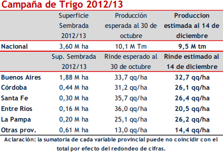 Hay una fuerte disminución en la cifra de producción de trigo, respecto del informe precedente, al recortar el rinde de 29,5 qq/ha a 27,4 qq/ha como promedio nacional. Teniendo en cuenta que se parte de una superficie sembrada de 3,6 millones de hectáreas y de un área sin cosechar de 140 mil hectáreas, la producción 2012/2013 resultaría en 9,5 millones de toneladas de trigo.