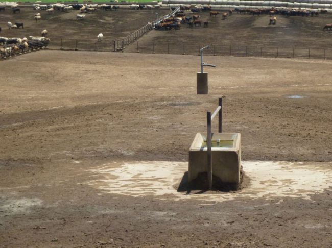 El frente de bebedero a disponer es muy relativo al caudal, pero se recomiendan al menos 3 cm por animal (y hasta 7 cm/animal ya que el consumo de agua puede llegar a triplicarse en días de intenso calor). El bebedero no debería ser compartido entre corrales y debería estar en la mitad del corral más alejada del comedero, ubicado sobre una plataforma de cemento que cubra un área de hasta 2 mt para poder soportar la acción del peso y las patas de los animales.