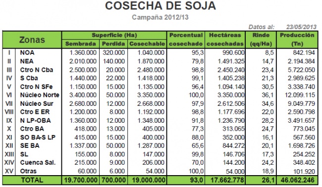Finalmente, en la región bonaerense se concentran poco menos de la mitad de los cuadros de primera aún pendientes de cosecha, junto con la mayoría de los lotes de segunda también a la espera de ser recolectados. Si las condiciones climáticas de los próximos días favorecen el avance de las cosechadoras ello permitirá posicionar la recolección casi al cierre nacional de la campaña 2012/13 para nuestro próximo informe.