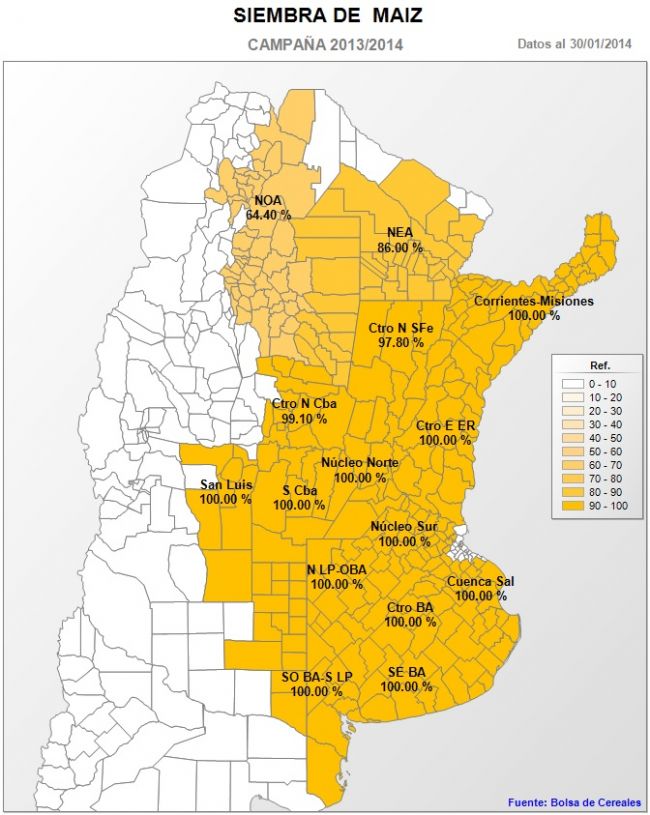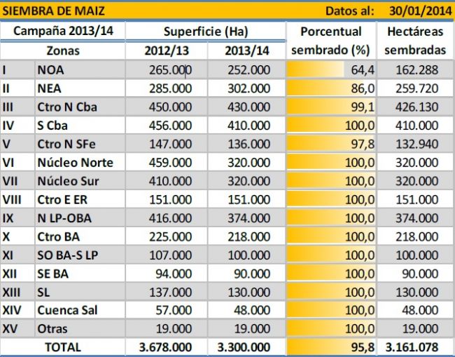 A la fecha se lleva implantado el 95,8 % del área proyectada en 3.300.000 Ha. El avance intersemanal fue de 5,8 puntos porcentuales y el retraso interanual es de tan sólo -2,9 puntos. En números absolutos ya se sembraron más de 3,16 MHa, habiéndose registrado los mayores avances en las provincias de Salta, Tucumán, Santiago del Estero, Chaco y en el norte de Córdoba. En esta última provincia no sólo se están incorporando lotes tardíos y de segunda ocupación, sino que varios productores están aprovechando la humedad que hoy presenta el perfil para resembrar maíz sobre los rastrojos del cereal que han sido picados semanas atrás.