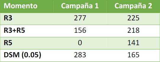 Asimismo, controles dobles (R3+R5), salvo excepciones, no tienden a mostrar ventajas significativas. El cuadro 1 muestra un ejemplo de la magnitud de respuestas según momento de aplicación de fungicidas en ensayos realizados en dos campañas en el centro de Buenos Aires.