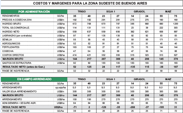 El cuadro adjunto muestra la proyección de resultados para la zona sudeste de Buenos Aires sobre la base de los precios estimados a cosecha 2014 para trigo y granos gruesos. Se presentan las cifras para los cultivos realizados por administración en campo propio y bajo la forma de arrendamiento en campos de terceros.