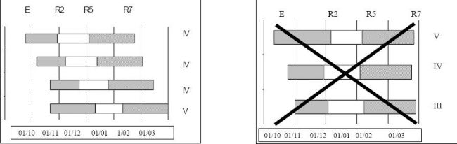 Con respecto al uso de cultivares de distinto ciclo y fechas de siembra en los cuadros de abajo, se detallan dos situaciones contrastantes de manejo. Por un lado, en el cuadro A se observa una elección de cvs y fechas de siembra adecuada, donde con sólo dos cultivares de dos GM diferentes se obtiene un escalonamiento de sus períodos críticos. Por otro lado, en el cuadro B se observa que de utilizarse en cada fecha de siembra un cultivar del GM que mejor se comporta en cada una de las mismas, se puede generar involuntariamente una sincronización del período crítico de todos los cultivares, con el consiguiente aumento del riesgo ante eventuales inclemencias climáticas y/o la ocurrencia de ataques de plagas.