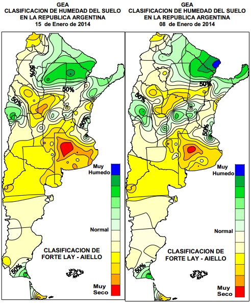 Sobre el maíz, el informe de GEA advierte sobre la disminución de rinde mínimo esperado en los maíces de primera y afirma que aumenta la brecha de condición fisiológica entre los maíces que fueron sembrados temprano y los tardíos. Los primeros, fueron castigados duramente por la ola de calor y presentan mermas definidas de hasta un 30% del rinde potencial. Además, sigue cayendo el rinde mínimo esperado, sobre todo en el noroeste de Buenos Aires. En el centro de Santa Fe prevén lograr entre 70 a 100 qq/ha y puntualmente para el este de Córdoba el pronóstico sigue siendo bueno. Los maíces tardíos están entrando en la etapa de crecimiento rápido. Si bien el estado general es muy bueno, comienzan las altas demandas por parte del cultivo y el nivel hídrico actual es deficiente para suplirlas.