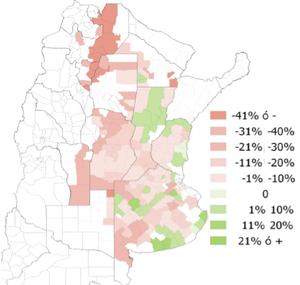 Los promedios de ambos cultivos engloban datos muy variados dentro de cada zona y entre las zonas. Por ejemplo, las mayores caídas de rendimiento en los granos gruesos se observan en las provincias del noroeste argentino, con valores superiores al 40 por ciento, con casos extremos de lotes que no se cosecharán. Otras zonas muy afectadas fueron el norte y sur de Córdoba, este de San Luis y noroeste y sudoeste de Buenos Aires, con pérdidas superiores al 30 por ciento.