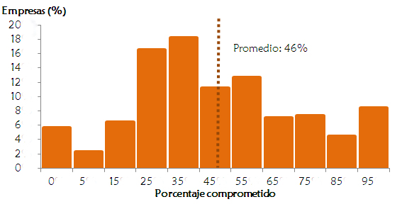 Los resultados económicos de la campaña de granos gruesos serán muy ajustados por la disminución de rendimiento de soja y maíz, que se combinará con pérdida de cultivos sembrados, con la imposibilidad de siembra de lotes inundados y con el aumento de costos de implantación y protección. La datos relevados muestran que, en promedio, los encuestados tienen comprometido el 46% de la cosecha con proveedores, crédito bancario, etc. (Ver gráfico 2).