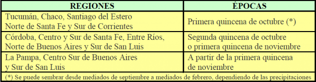 1) Siembra sobre soja o maní: las malezas se controlan con barbecho químico en invierno y en primavera, en presiembra. Se siembra cuando existan condiciones adecuadas de temperatura y humedad del suelo.