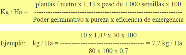 Para el cálculo de los kg de semillas por hectárea necesarios para la siembra, puede usarse la siguiente fórmula: