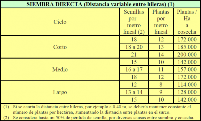 Las mayores densidades se pueden utilizar en caso de ciclos cortos a intermedios en siembras directas e incluso con menor espaciamiento entre hileras para lograr una rápida cobertura y menor competencia de malezas.