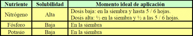 Al fertilizar, debe cuidarse que los fertilizantes no se coloquen en contacto directo con la semilla, especialmente los más solubles, para evitar daños a la plántula por fitotoxicidad.