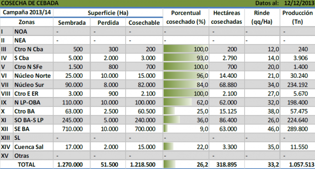 En el Sudeste de Buenos Aires, donde se concentra el 56 % del área de cebada a nivel nacional, hubo un frente nuboso que descargó granizo en la zona de Lobería, parte de Necochea y B. Juárez, generando daños de distinta magnitud en los lotes afectados. De estos cuadros, los primeros ya cosechados entregan rendimientos cercanos a los 35 qq/Ha, muy por debajo de aquellos lotes que llegan sin inconvenientes a cosecha, con rindes que oscilan los 70 qq/Ha. Puntualmente, en la ciudad costera de Miramar se generaron fuertes tormentas (hasta 155 mm) y vientos, lo que provocó revuelcos en lotes de cebada que ya se encontraban en madurez. Si bien estos fenómenos generan disminuciones en los volúmenes cosechables en zonas puntuales, el grueso del sudeste bonaerense se encuentra en un muy buenas condiciones, entregando un rinde regional de 46 qq/Ha.