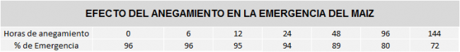 No se encontraron diferencias significativas de pérdida de plantas en las primeras 24 horas de anegamiento. El porcentaje de emergencia comenzó a declinar a las 48 horas, y continuó haciéndolo con cada aumento sucesivo de la duración del anegamiento