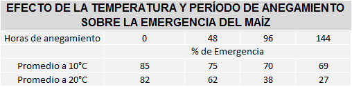 Cada incremento sucesivo en la duración del anegamiento resultó en una disminución del porcentaje de emergencia. La temperatura más alta produjo una menor emergencia para cada uno de los tratamientos de duración. Con 96 horas (4 días) de anegamiento, la emergencia con alta temperatura fue cercana a la mitad de la lograda con la temperatura más baja.