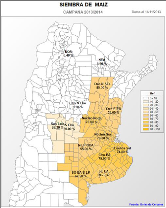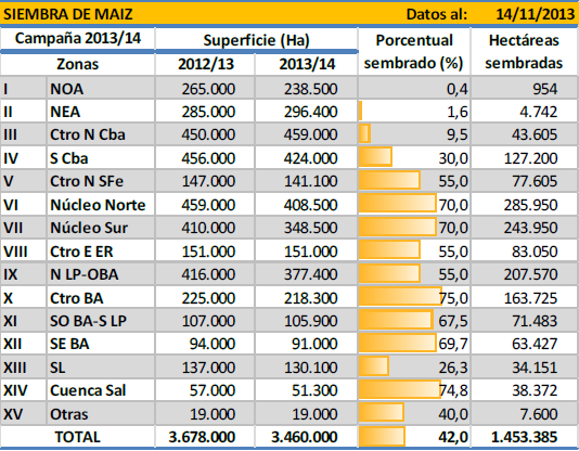 Al presente informe se registró un progreso nacional del 42 %, sobre un área proyectada de 3.460.000 . El avance intersemanal fue de tan sólo 3,2 hectáreaspuntos porcentuales, quedando un retraso interanual de - 3 puntos. Cabe mencionar que se retomaría el flujo de siembras tardías hacia fines del mes de noviembre, cuando los productores de zona núcleo encaran la segunda etapa de siembra maicera.