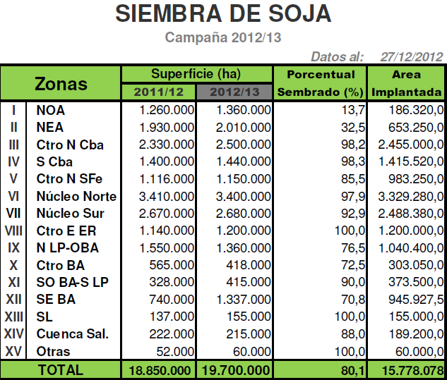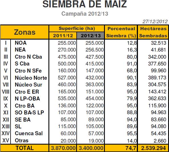 Sobre este escenario, mantenemos nuestra estimación de producción de 3.200.000 de toneladas hacia fin de campaña, ubicándose un 11,1 % del volumen obtenido el pasado ciclo (2011/12, 3.6 MTn).
