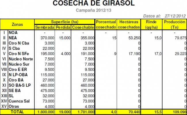 Avanza lentamente la trilla de girasol en el norte del área agrícola nacional, puntualmente en el este de Santiago del Estero, Norte de Santa Fe y Chaco. A la fecha se ha recolectado el 4% del área apta nacional, entregando un rinde medio de 15,5 qq/Ha. En números absolutos, la superficie cosechada estaría alcanzando unas 70 mil hectáreas.