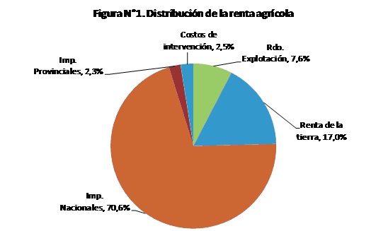 La renta agrícola es el resultado de restar el componente gastos y costos del valor bruto de producción a valores FOB, y se reparte entre la renta de la tierra después de impuestos (17%), el resultado después de impuestos de la explotación agrícola (7,6%), los costos de intervención (2,5%), los impuestos provinciales (2,3%) y los impuestos nacionales (70,6%).