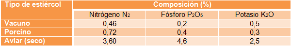 En la siguiente tabla se muestran los principales macronutrientes, dependiendo del material de carga. Son valores aproximados y pueden variar según el tipo de alimentación del animal, la raza y el tratamiento que reciban tanto los animales como el estiércol antes y después del proceso de digestión: