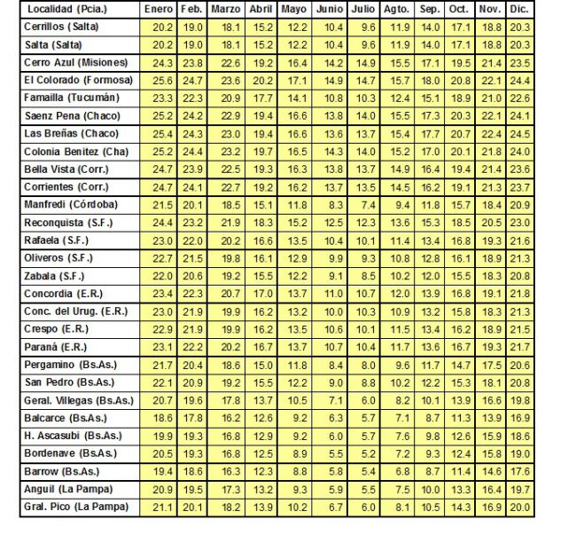Tabla N° 1: Temperaturas límites recomendadas para la programación de controladores automáticos en base a termostatos, para diferentes localidades y a lo largo del año. Fuente: Bartosik Ricardo y colaboradores – INTA PRECOP.