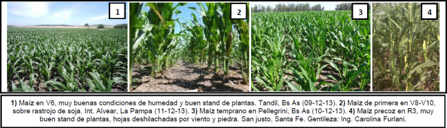 El maíz con destino grano comercial en el Oeste de Bs. As. y Norte de La Pampa muestra una tendencia similar a la de Córdoba, por buscar un alto porcentaje del cultivo en siembras tardías. Se evidencia la caída en superficie respecto de lo sembrado la pasada campaña, dado que el productor ha trasladado un porcentaje del área a la siembra de soja. Por otra parte, los cuadros de siembras tempranas se encuentran transitando etapas que van desde las seis a las ocho hojas expandidas (V6-V8) habiéndose re-fertilizado en muy buenas condiciones. Se releva incidencia de roya en algunos cuadros, que ya están siendo tratados.
