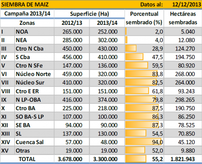 A la fecha se ha incorporado el 55,2 % del área proyectada para esta campaña en 3.300.000 hectáreas, porcentaje que en números absolutos representan más de 1,8 MHa. El avance intersemanal registró un progreso de 7,8 puntos porcentuales y denota un retraso interanual de -4,8 puntos.