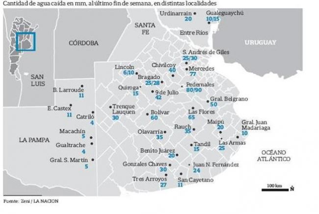 El fin de semana pasado, las precipitaciones se concentraron en el centro, sur y este de la provincia de Buenos Aires, con registros de entre 15 y 70 milímetros. Allí se hace el 50% del trigo a nivel nacional (casi dos millones de hectáreas, sobre un total estimado para este ciclo de 3,9 millones de hectáreas), y luego de la siembra presentaba buenas condiciones.