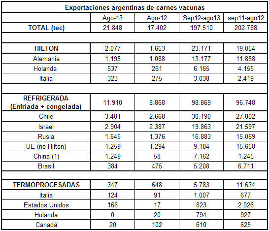 Las principales variaciones entre agosto y julio de este año se explican por incrementos en varios destinos: 500 tn (peso embarque) en la cuota Hilton; 400 tn en las ventas a Europa fuera de la Hilton; entre 300 y 350 tn en Chile, Rusia y China, en cada caso; y 150 tn a Israel. Como contrapartida, hubo una caída de 600 tn en los envíos a Marruecos.