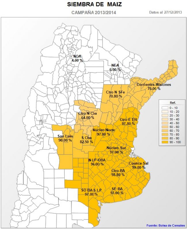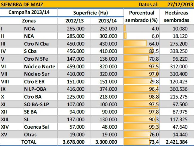Habiéndose logrado cubrir el 73,4 % del área proyectada para esta campaña en 3.300.000 hectáreas, la siembra de maíz destino grano comercial presenta un progreso intersemanal de 8,2 puntos porcentuales y un retraso interanual de tan sólo -1,3 puntos. En números absolutos, se implantaron más de 2,4 Millones de hectáreas.