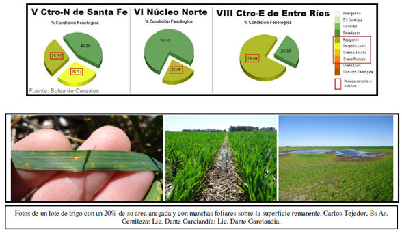 Diferente situación se observa sobre el Núcleo Norte, Centro-Norte de Santa Fe y Centro- Este de Entre Ríos, en donde se encuentra implantada un 16% de la superficie nacional estimada en 3.600.000 hectáreas. Si bien en todas estas regiones la condición hídrica en los cuadros también es buena, una parte del área sembrada se encuentra transitando estadios sensibles a los bajos registros térmicos (espigazón/floración) y por tal motivo podrían relevarse mermas sobre el potencial de rinde a cosecha en estas regiones.