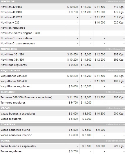 Los compradores buscaron desde temprano la hacienda y al comienzo de los remates los consignatarios no tuvieron que esforzarse mucho. Hubo agilidad en todas las subastas y principal atención a los lotes de novillitos -3 por ciento de incremento-, categoría que hasta la semana pasada se había quedado muy atrás. A la suba de esta categoría se sumó la del novillo en el orden del 1 por ciento -con máximos de $11,50-, y la vaca, que mejoró hasta un 4 por ciento y por la cual se pagó un lote de 500 kilos $10,80. Acompañó el toro con una suba del 5%.