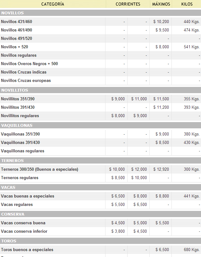 Otro factor que impulsa las bajas es que un importante supermercado no está operando. Esto generó que los compradores que habitualmente siguen el ritmo de esta gran cadena, marquen el suyo propio y de esta forma se presentaron quebrantos importantes que llegaron hasta $2 por kilo de novillitos. Este marco de situación que se dio la semana pasada, hoy se mantuvo. El novillito arrastró al novillo y a los terneros.