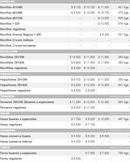 Comparado con el Miércoles, mejoraron novillos, vacas y terneros. Además, las vaquillonas dieron que hablar, acompañando después de mucho tiempo la subida de la vaca. Subieron un 5% y marcaron máximo de $11,50 por un lote de 358 kilos.