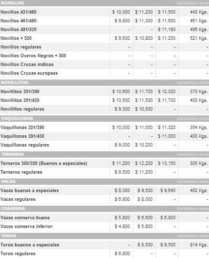 A primera hora, los compradores consultaban por los lotes de novillitos y vacas, que fueron -junto con el novillo- las tras categorías que hoy se destacaron. También mejoraron las vaquillonas y los terneros se mantuvieron como en el cierre del período anterior. Con respecto a esta ultima categoría cabe, resaltar que la firma Sáenz Valiente, Bullrich y Cía. vendió terneros de 305 kilos en $13,15, pero fue sólo un lote cortado del resto.