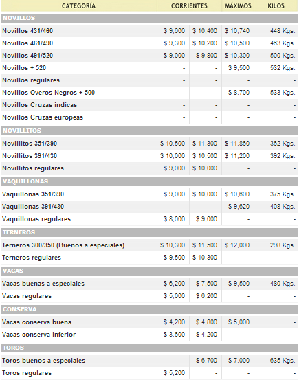 Hoy, comparado con la rueda previa, el mercado perdió parejo entre un 2 y un 5%; pero si tomamos de referencia el cierre del período anterior, los quebranto son un poco mas pronunciados. Las que más perdieron fueron las vacas con bajas de un 5%, seguidas por terneros y novillitos (-3%) y novillos (-2%).