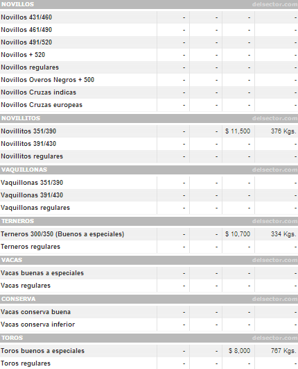 Se negociaron terneras de 335 kilos en $10,70, novillitos de 376 kilos en 11,50 y se pagó $8,00 por tres toros de 767 kilos.