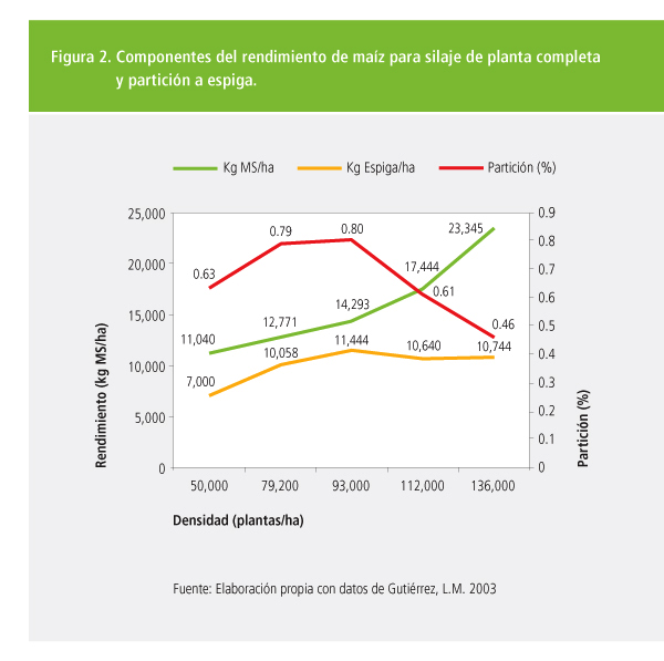 Como se mostró anteriormente, a medida que se aumenta la densidad de siembra, aumenta el rendimiento, pero se modifica sensiblemente la proporción de espiga en ese forraje producido. Si bien el rendimiento en grano no se modifica en gran medida, aunque se observa una leve caída, sí disminuye la proporción de espiga por un aumento del componente caña más hojas. Esto se puede observar en la figura 2, que corresponde a datos obtenidos en la EEA INTA Balcarce en un ensayo en condiciones con alta fertilización, control de malezas y sin riego complementario.