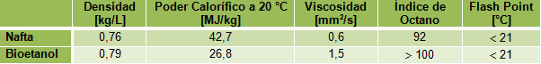 A continuación se presentan algunas especificaciones técnicas del bioetanol en comparación con la nafta.