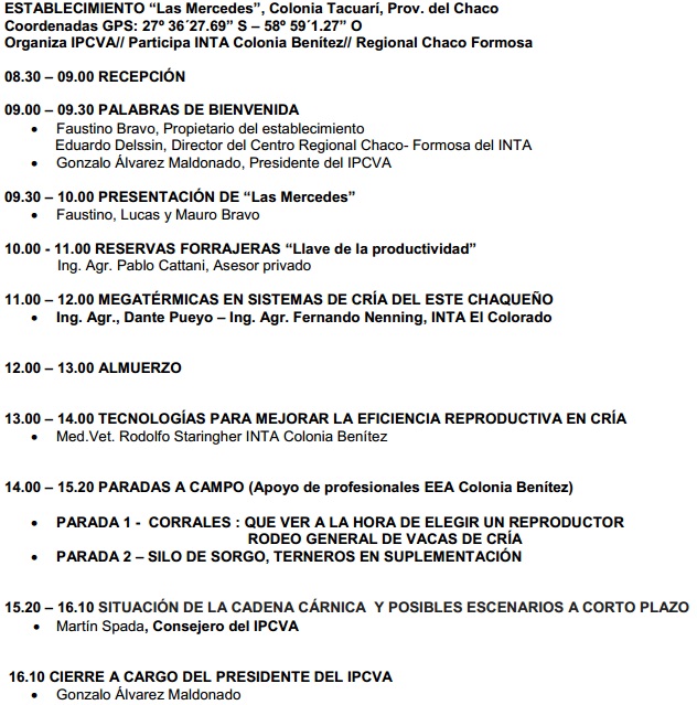 Algunas de las charlas fueron las siguientes: “Reservas forrajeras, llave de la productividad” (Pablo Cattani, Asesor privado), “Megatérmicas en sistemas de cría del este chaqueño” (Dante Puedo y Fernando Nenning, INTA El Colorado), “Tecnologías para mejorar la eficiencia reproductiva en cría” (Rodolfo Staringher INTA Colonia Benítez) y “Situación de la cadena cárnica y posibles escenarios a corto plazo” (Martín Spada, Consejero del IPCVA).